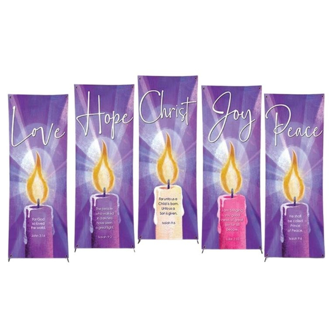This banner set features clear and vibrant images printed in high resolution. Like a traditional Advent candle set, the banner set includes three purple candle banners, one rose candle banner and one white Christ candle banner.