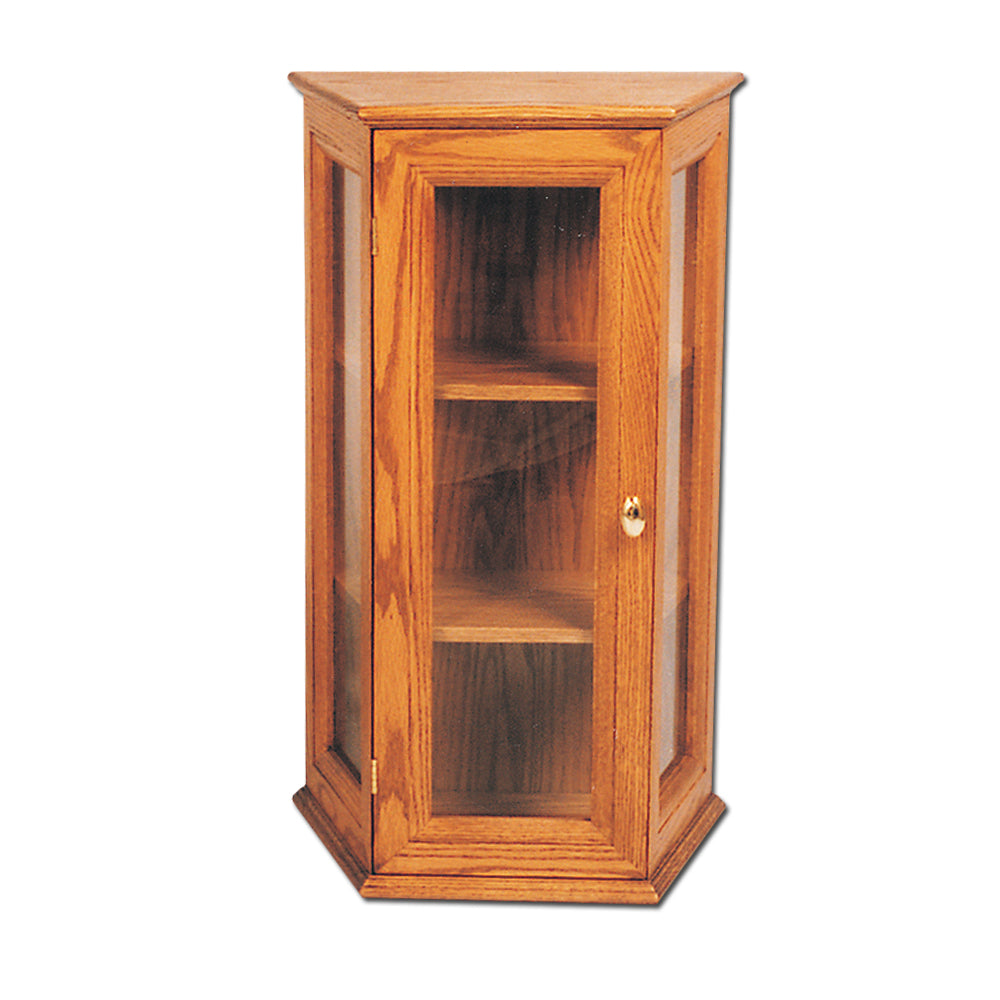 Solid Oak Ambry with glass pannels and adjustable wood or glass shelves, with brass lock.