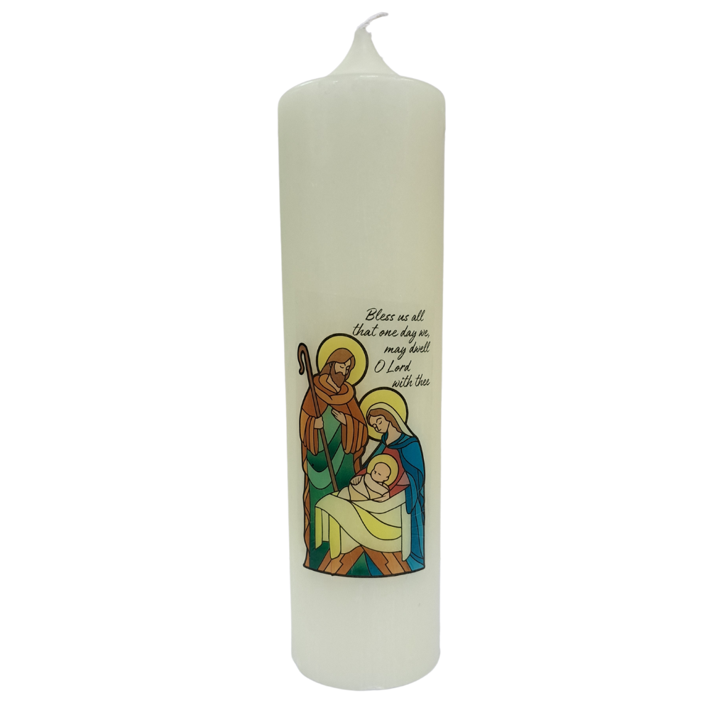 This home paschal candle features the Holy Family. "Bless us all that someday we, may dwell 'O Lord with thee."