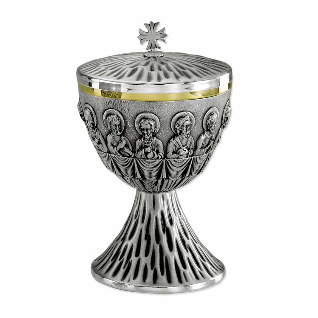 Brass ciborium featuring the Twelve Apostles with two-tone silver & gold plate.