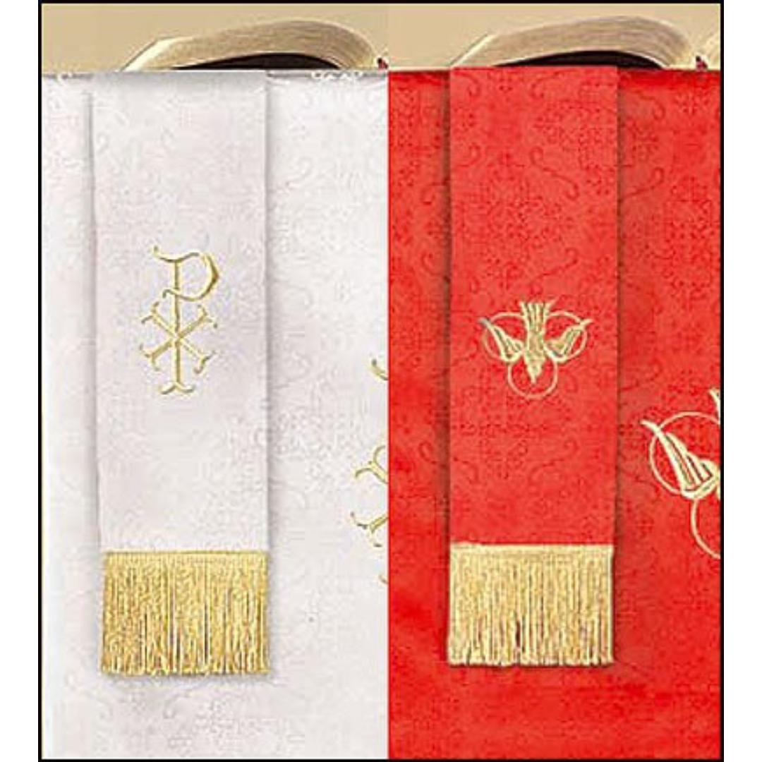 This fully lined reversible jacquard bookmark has embroidered gold symbolism appropriate for the Easter, Trinity, Pentecost, Christmas, and Confirmation Seasons.