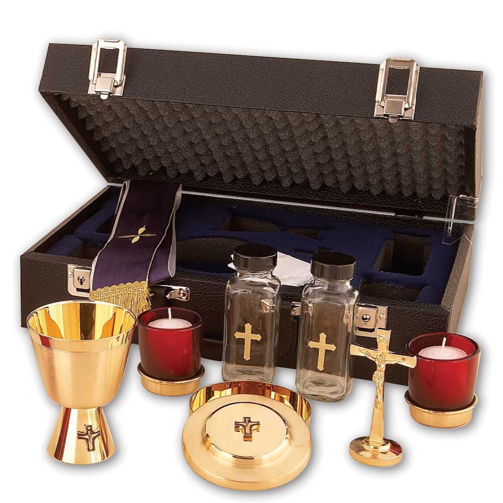 Compact Mass Kit.Contains:* Chalice 3 3/4" ht 4oz* Host box cap 60* Cross ht 3 3/4"* Candle/holders 2" ht* Cruets with etched Cross 4ozLockable Case measures 14 1/2" x 9 1/2" x 4 5/8"