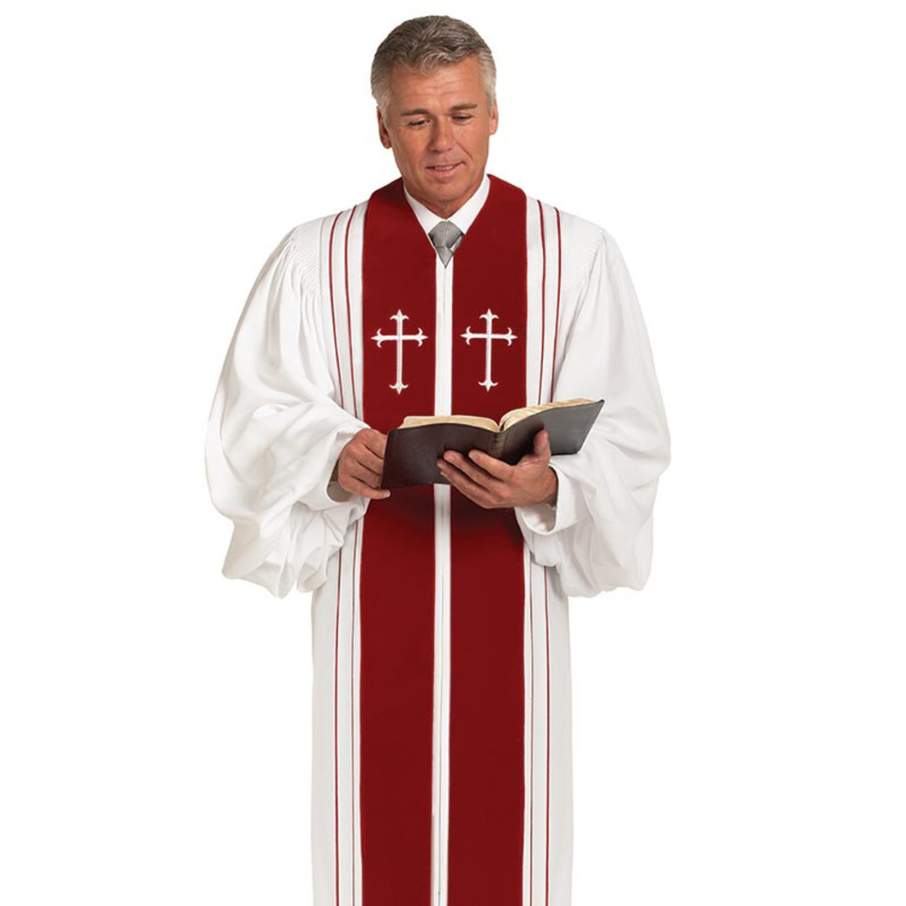 Tailored in white Wonder Crepe with scarlet piping. Embroidered latin crosses on front velvet panels. Features lined bell sleeves with deep cuffs and fluted over shoulders and across back.