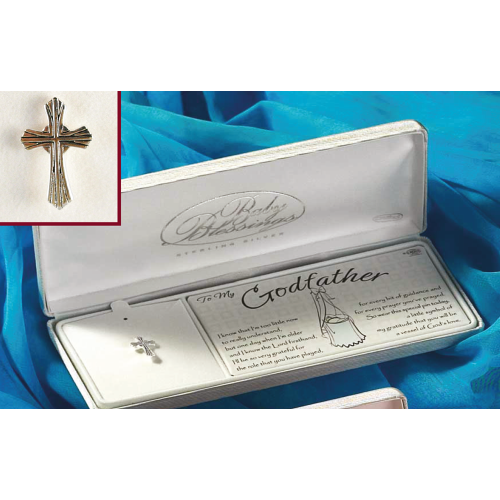 Sterling Silver “To My Godfather” Ribbed Flare Cross with Starburst Lapel Pin.