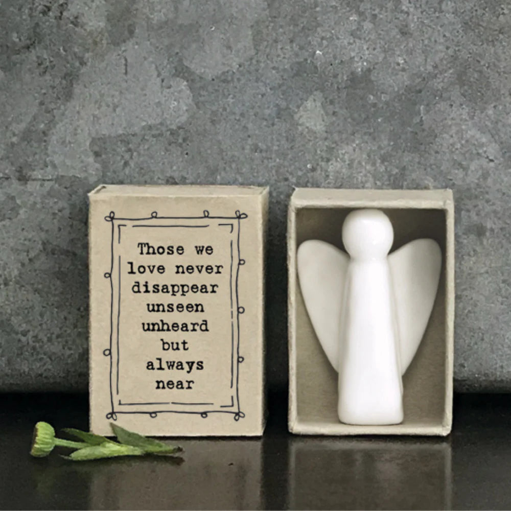 Discover the ethereal beauty and delicate grace of our matchbox porcelain angel, a timeless treasure crafted to inspire awe and wonder. Nestled within a miniature matchbox, this exquisite porcelain angel embodies serenity and celestial charm in its smallest form. Each angel is a testament to meticulous attention to detail and a reverence for the divine. Whether adorning your home as a symbol of protection and guidance or gifted to a loved one as a token of faith and hope, our matchbox porcelain angel serves as a gentle reminder of the unseen forces of goodness that surround us. Embrace the magic of the heavenly realms with this enchanting creation, destined to uplift spirits and ignite imaginations wherever it goes.