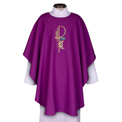 Embroidered Chi Rho with grapes and wheat has reinforced backing to ensure a smooth design.
