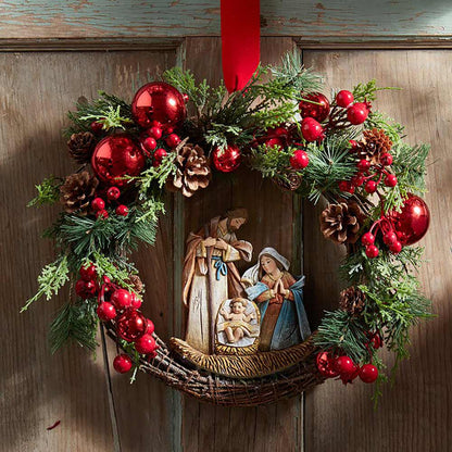 A nativity Advent wreath that stands out from the rest. Complete with all the traditional detailing, this brightly coloured and full of life wreath features a finely crafted Holy Family in the centre.