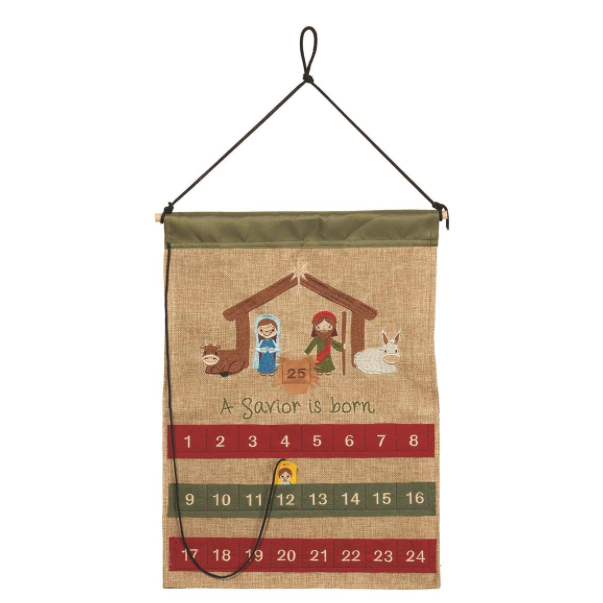 A Saviour is Born Fabric Advent Calendar - This wall calendar is a beautiful Christmas decoration, as well as a fun way to count the days until December 25! Before Christmas, just place the attached Baby Jesus piece into the pocket embroidered with the number of that days date. Then, on Christmas Day, place it in the manger pocket, embroidered with 25. The entire nativity scene, along with: A Saviour is born; is exquisitely embroidered on burlap style polyester fabric.