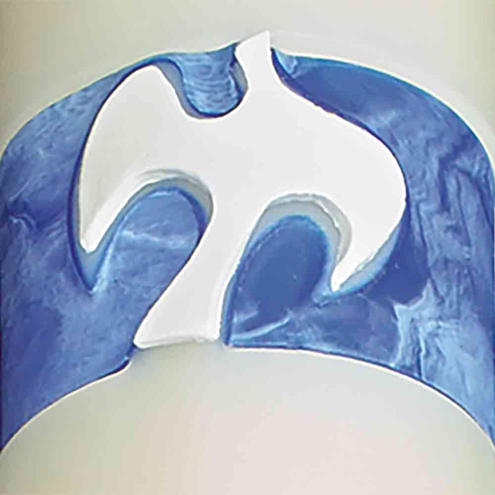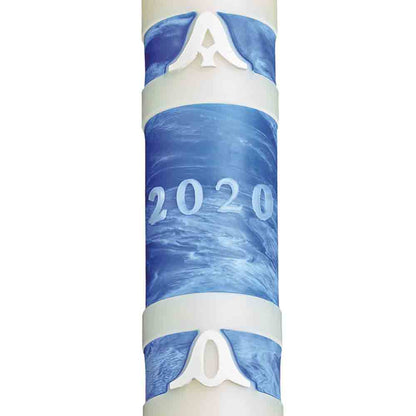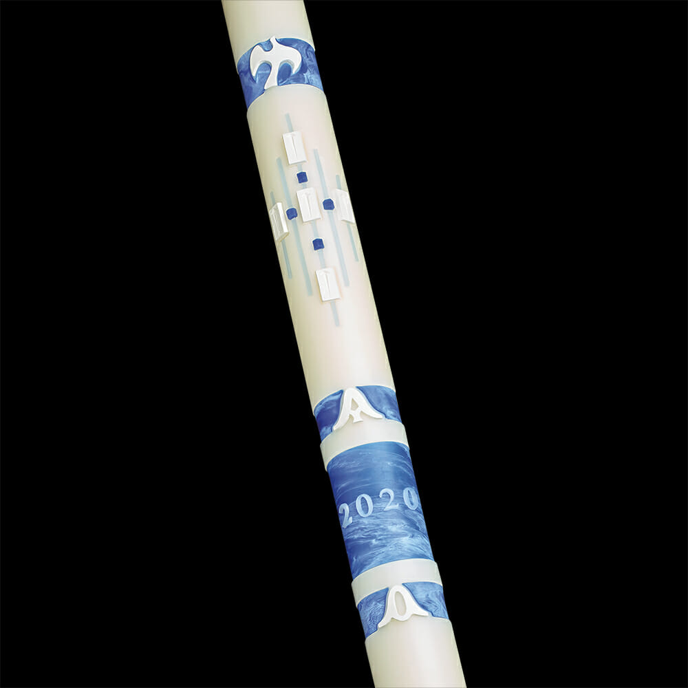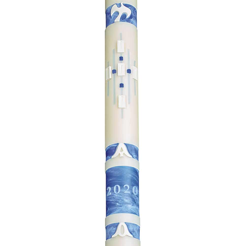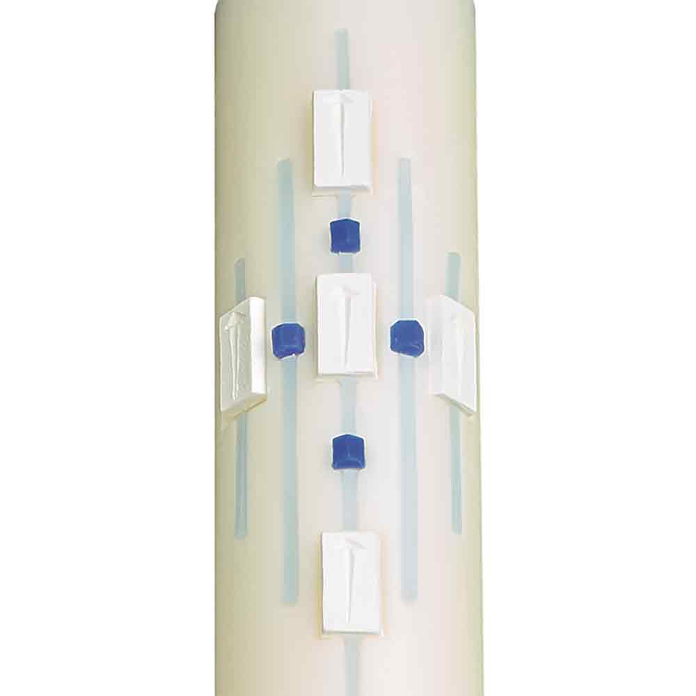 Ascension 51% Beeswax Paschal Candle Ascension heralds the risen Christ and features meticulous craftsmanship in an artistic pallet of soft celestial hues in sky blue and angelic white. The glorious centre cruciform presents the appearance of movement and rises upward from the flowing Alpha & Omega toward the ascending dove symbol of the Holy Spirit. During Easter Vigil services, the five incense pin tiles are placed in the cruciform, sealing the incense grains.