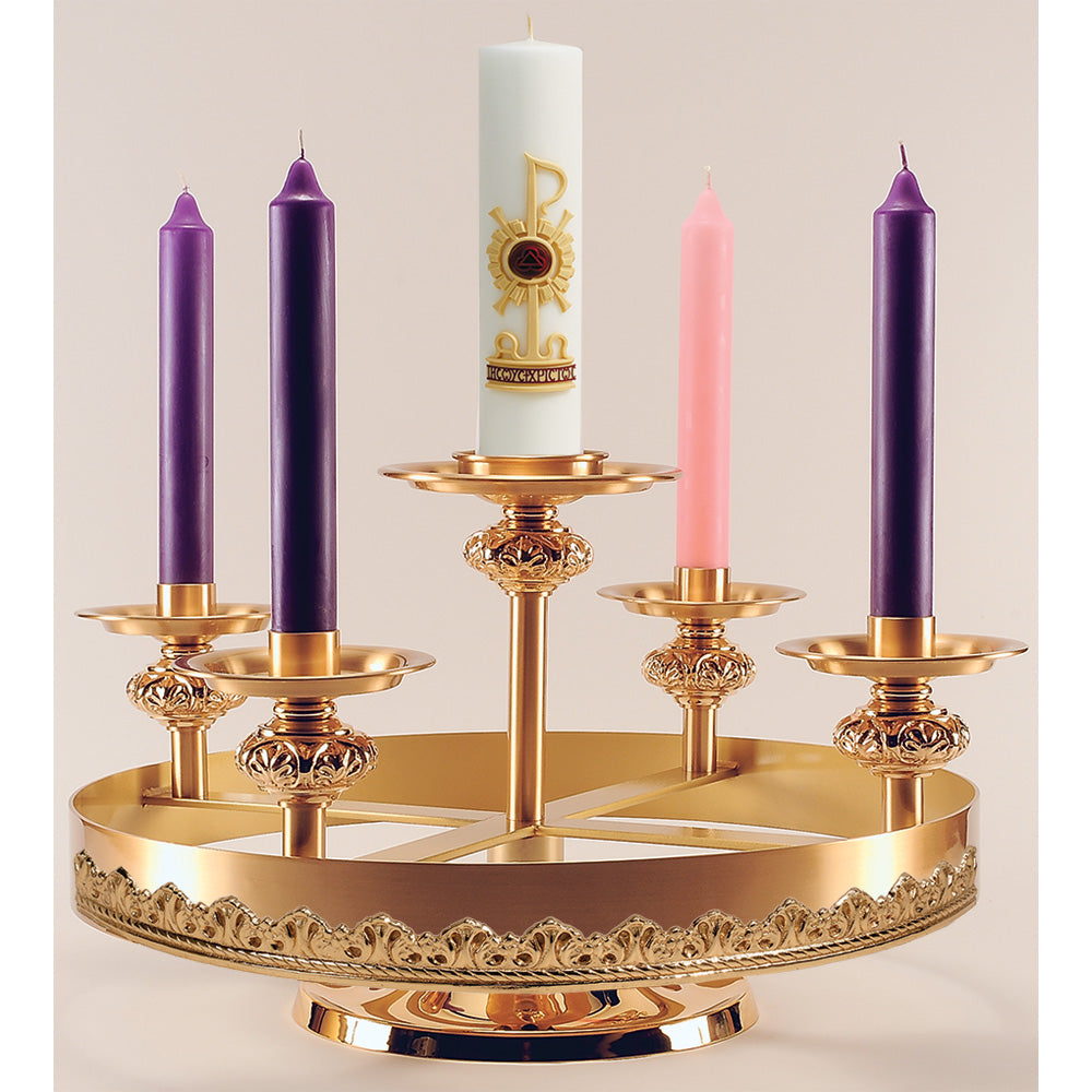 Overall Height 15 1⁄4”, Overall Dia. 27”, Ring Dia. 23”, Base Dia. 12”. Combination Satin & High Polish Bronze Finish.Wreaths supplied withcentre adapter pin 1 15⁄16” Dia. to fit paschal or floor candlestick sockets. Also supplied with 4” Dia. Christ candle center socket, 11⁄2” Dia. perimeter sockets and clear plastic wax protectors. Set of 51% beeswax Advent candles & Christ candle included.DURABLE OVEN BAKED FINISH