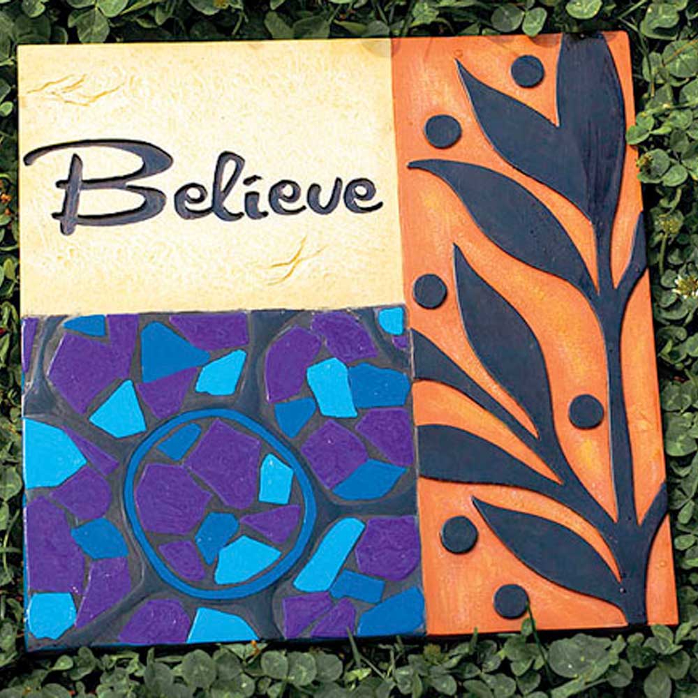 For indoor or outdoor use. Hand-painted garden stone plaque made from resin-stone mixture. Placed outdoors in garden or can be hung on a wall.
