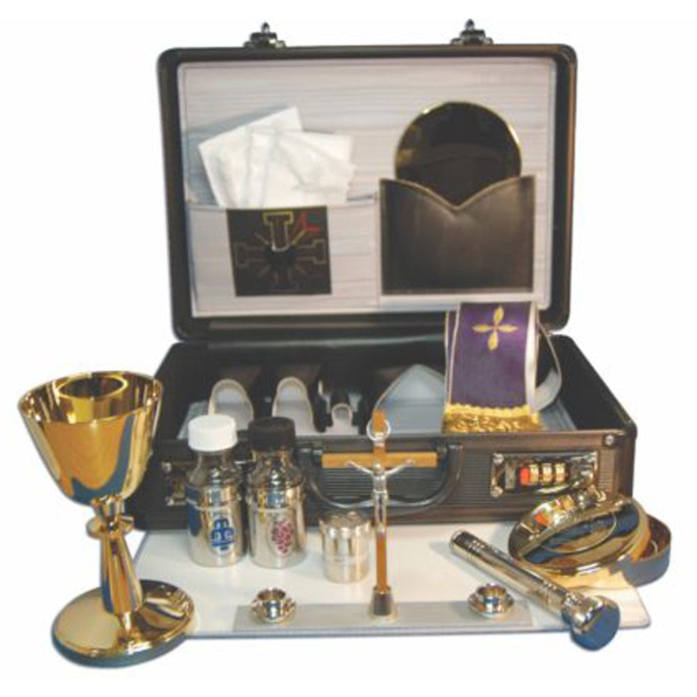 Smartly presented in an impeccably crafted case, measuring 12 inches by 8 1/2 inches by 4 inches, this exceptional Mass Kit contains a curated selection of sacred items. Meticulously assembled in Italy, it includes a Chalice measuring 5 inches in height with a capacity of 3 ounces, a Scale Paten standing 4 1/8 inches high accommodating 25 hosts, altar candles, a Sprinkler, a Stole, and Linens. The case features a convenient front locking mechanism for secure storage and easy access. Experience the reverence and quality of Italian craftsmanship in every detail of this remarkable Mass Kit.
