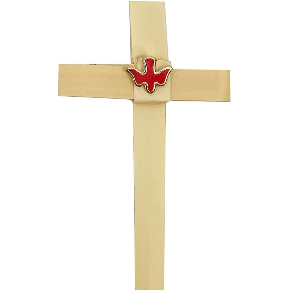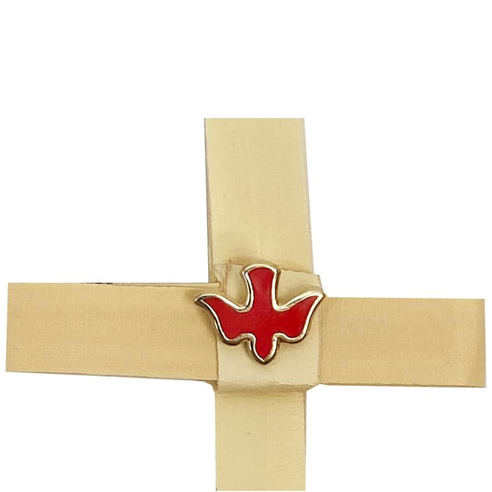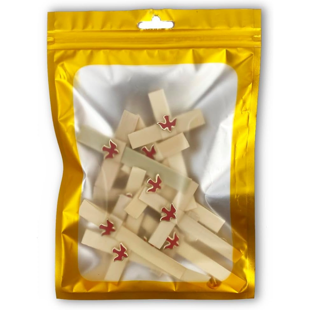 Our Indian Mini Palm Crosses with Holy Spirit Lapel Pin are beautifully handcrafted by skilled Indian artisans, making them a meaningful and unique addition to any religious celebration. Each cross is paired with a stunning red enamelled Holy Spirit Dove lapel pin, featuring a gold outline that adds a touch of elegance and reverence.