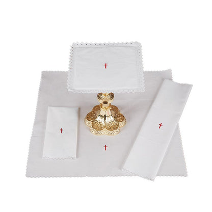 Set includes a scalloped edge purificator, a lace-trimmed chalice pall with insert, a corporal and a lavabo towel. Set comes packaged in a two-piece gift box.
