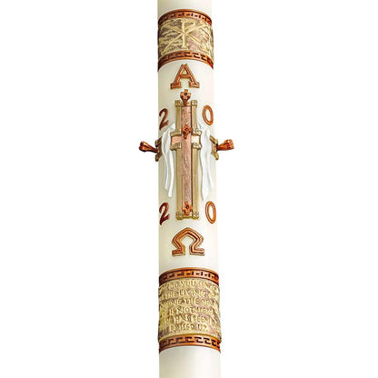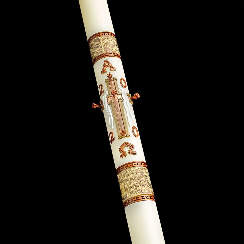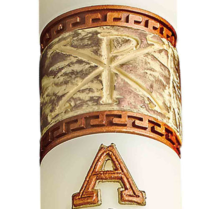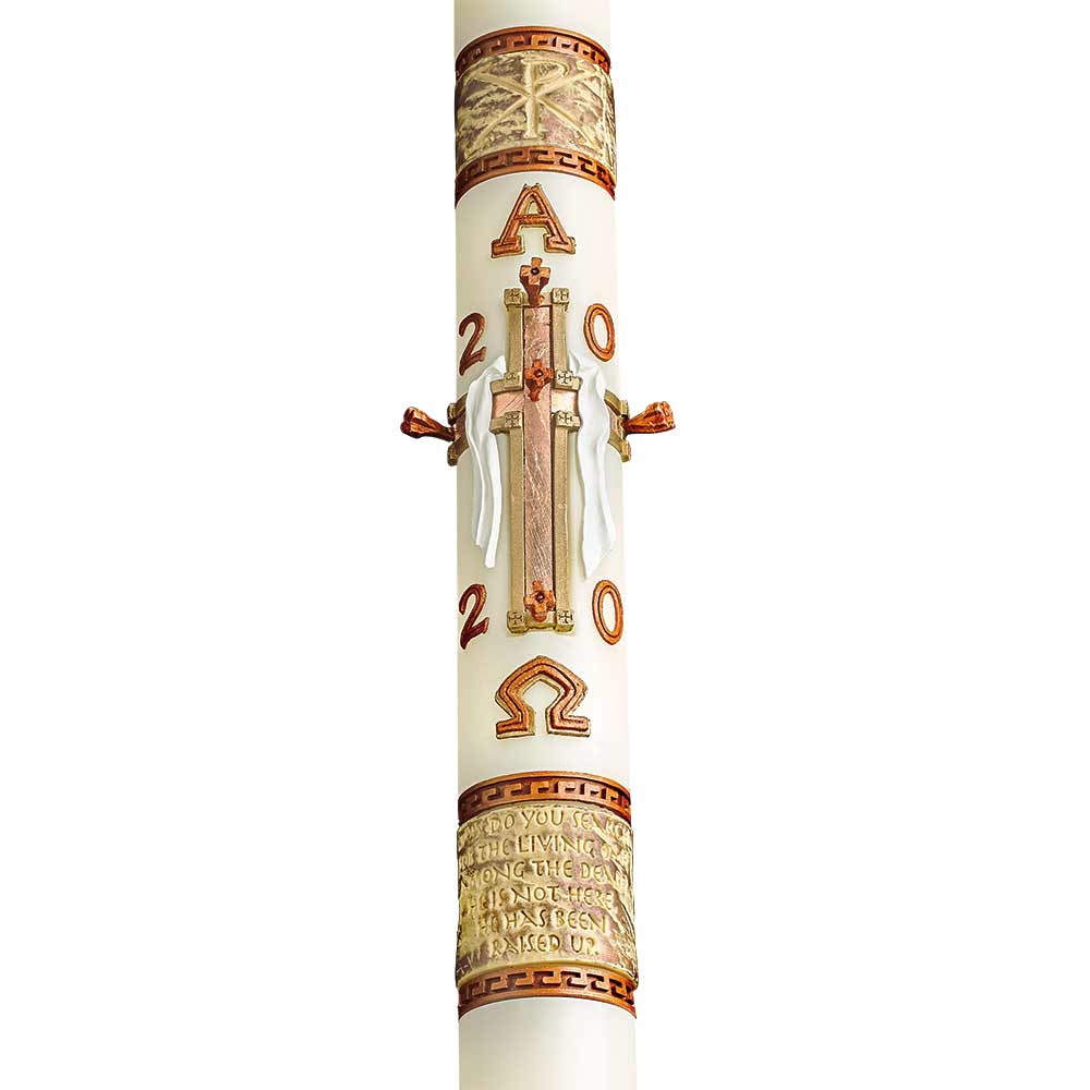 Luke 24 - 51% Beeswax Paschal CandleWe celebrate – “Why do you search for the living one among the dead?He is not here, he has been risen up”. Our Saviour Jesus Christ, on this morning we celebrate.One of the most resonating scripture reading of our faith emblazoned as the theme of this paschal candle. The burial shroud symbolically draped on his cross, his Chi Rho monogram triumphantly crowns the design ensemble. All rendered in wax with highlights of copper leaf and burnished with bronze wash. Luke 24™ Distinguished, Unparalleled, Extraordinary.