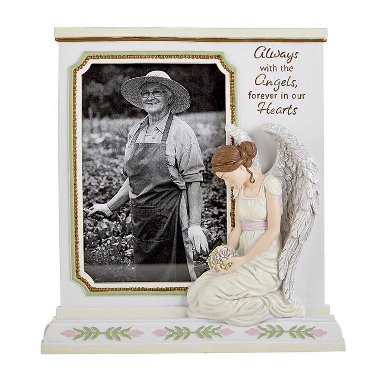 Cherish the memories of loved ones in this beautiful fashion with this memorial photo frame, featuring a kneeling angel and the phrase 'Always with the angels, forever in our hearts'.