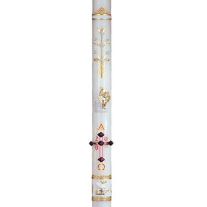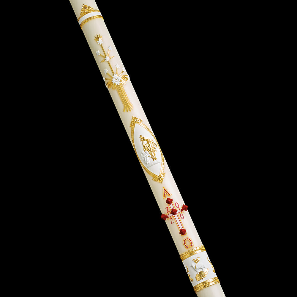 Ornamented, 51% Beeswax Paschal Candle - Developed by Cathedral Candle Company in 1986, SCULPTWAX®candles are skillfully decorated with hand-cast, colour infused wax. The beautifully detailed appliques create a striking and unrivalled, three-dimensional relief. Each Candle comes complete with current year date and wax incense pins.