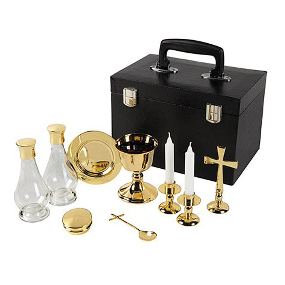 Mass kit includes chalice, paten, 2 glass cruets, cross, spoon, 2 candle holders & pyx.
