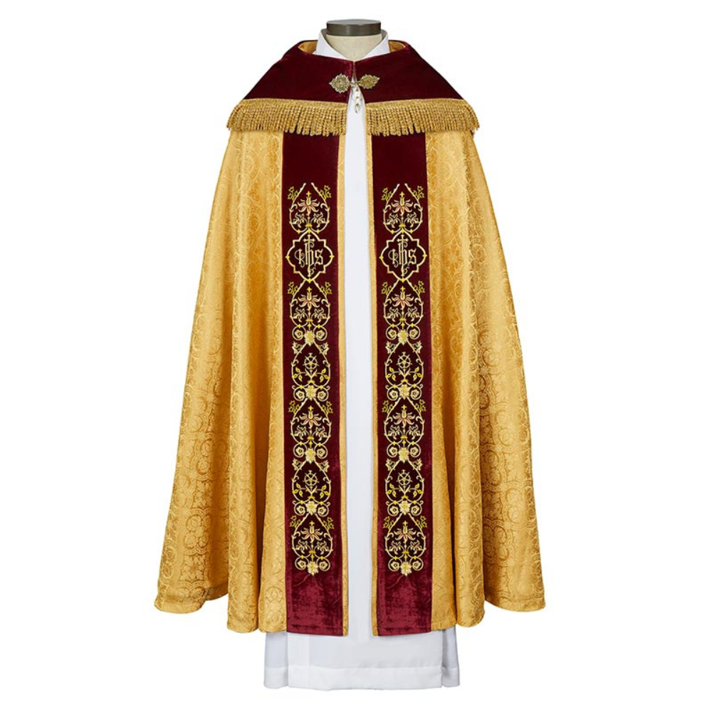 Gold Avignon jacquard fabric. Burgundy velvet with full embroidery.