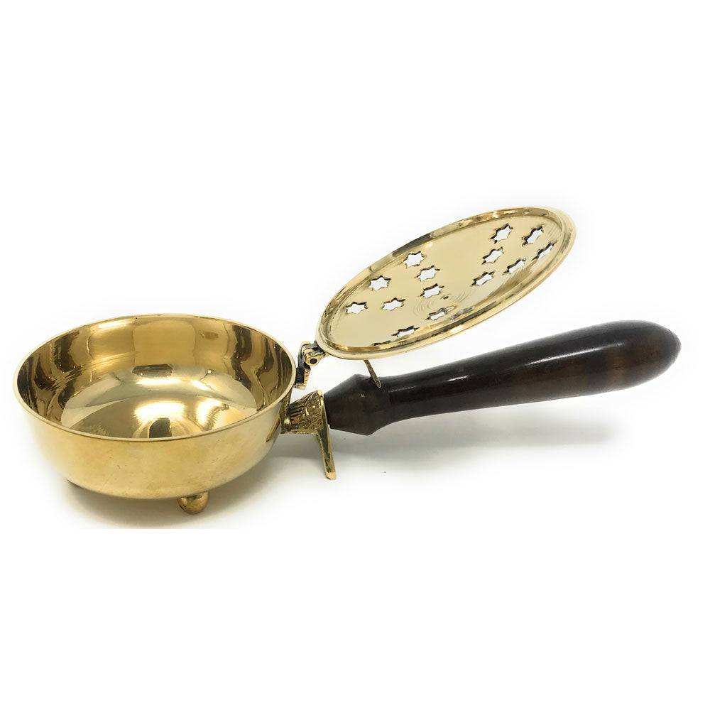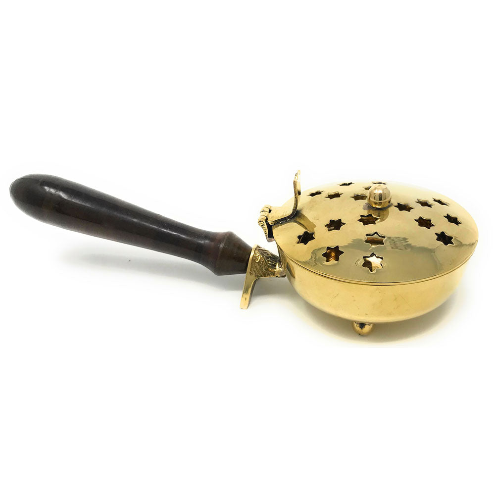 A very solid brass handmade incense burner with wooden handle. Fine workmanship with a top that opens for easy lighting.