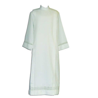Tropical Weight Polyester/Wool Blend Alb with 1" Latin Cross Lace on Sleeves and 3" Lace at Bottom.