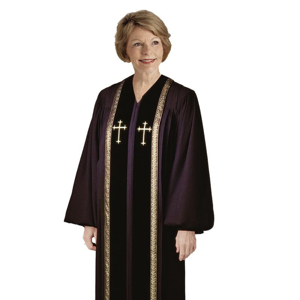Women's Wonder Crepe pulpit robe with velvet panels, gold metallic wheat design ribbon trim with embroidered gold metallic Latin crosses on the front velvet panels. Lined bell sleeves with deep cuffs, fluted over shoulders and across back, top stitched front pleats.
